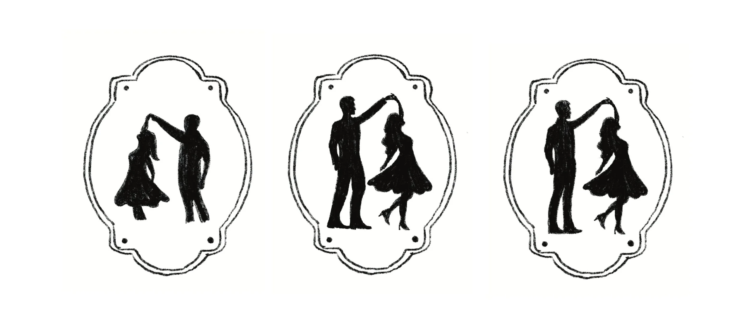 Using multiple different references photos of real life clients and stock dancing photos, I sketched many different versions of the cameo before we found the perfect combo of movement for both dancers.
